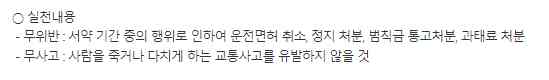 - 무위반:서약 기간 중에 운전면허 취소난 정지처분,범칙금 통고 처분,과태료 처분을 받지 않아야 합니다.