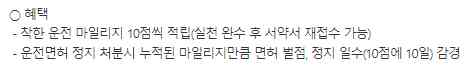- 법규 위반 없이 무위반, 무사고 준수 서약을 잘 지킬 시 착한 운전 마일리지 점수 10점에서 최대 50점까지 적립됩니다.