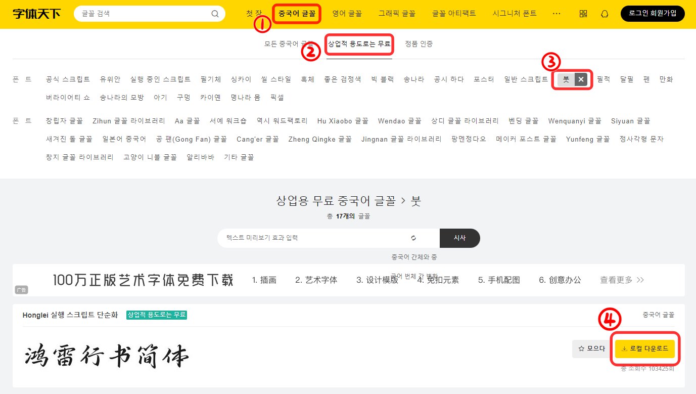 1. 아래 무료 폰트 홈페이지(字体天下)에 접속 후, 중국어 글꼴, 영어글꼴 등을 선택합니다.