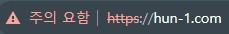 그런데 주소창을 보니 주의요함이라는 경고문구와 함께 https 에 빨간색으로 두줄로 빗금이 처져 있는것을 확인하게 되었습니다. 언제 보아도 붉은 삼각형에 느낌표는 왠지 모르게 기분이 좋지는 않은 것 같습니다.