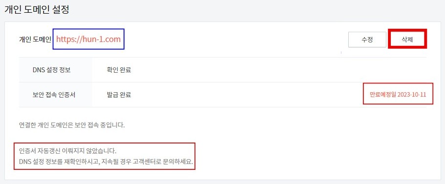- 개인 도메인을 다시 등록하게 되면 아래와 같이 보안 접속 인증서 발급 대기 중으로 확인이 되네요.