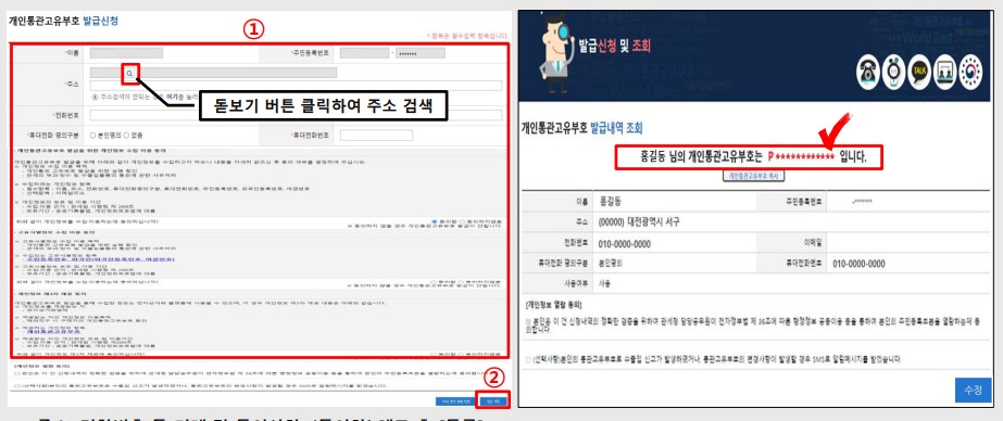 이름, 주민등록번호, 주소, 연락처를 작성하면 위 오른쪽 이미지와 같이 개인통관고유부호를 발급 받게 됩니다.