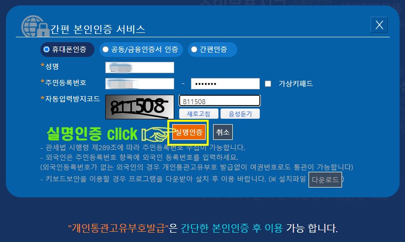 '개인통관고유부호발급'은 간단한 본인인증 후에 이용이 가능하다고 적혀 있습니다.